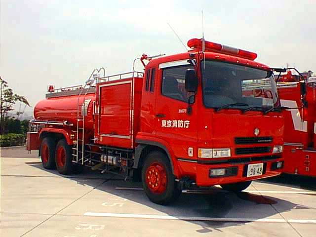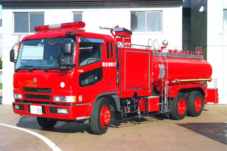10トン水槽車は、高速道路上の火災や河川敷の雑草火災の際に特命されます。 車両が停止状態であるのなら車両上部の放水銃から放水することも可能です。